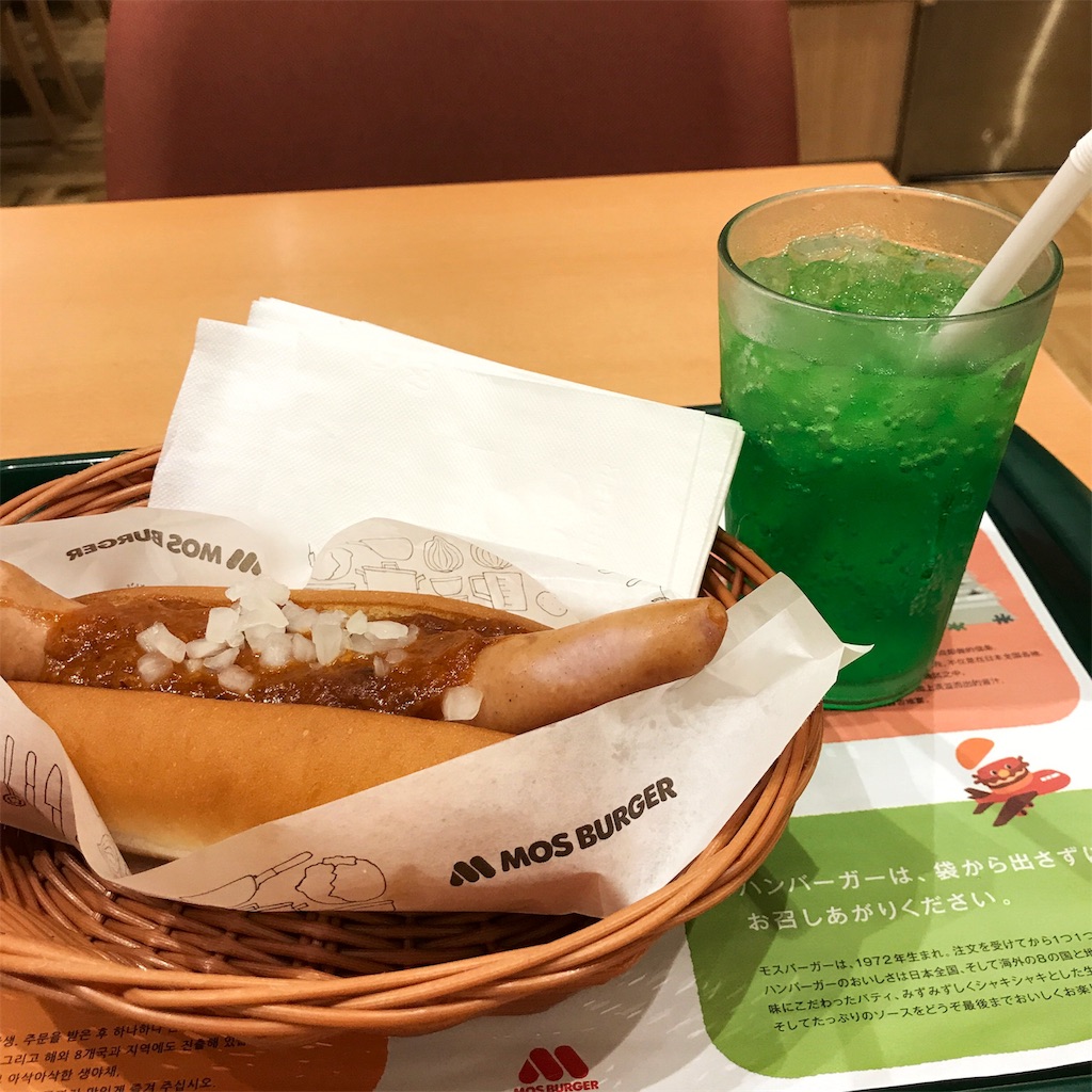 今朝は朝早いこともあったので、観光客ぽい中国人と大学生くらいしかいませんでしたが、店員さんが大きな声で「チリドッグ とメロンソーダですね?」と丁寧に繰り返してくれるので、これ朝の空いてる時間しかできないなと思いました。